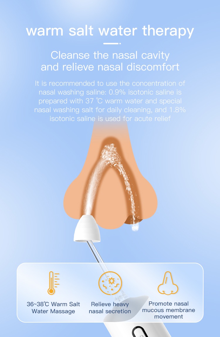 Det rekommenderas att använda koncentrationen av nästvättssaltlösning: 0,9 % isotonisk koksaltlösning: framställs med 37 °C varmt vatten och speciellt nästvättsalt för daglig rengöring, och 1,8 % isotonisk saltlösning används för akut lindring