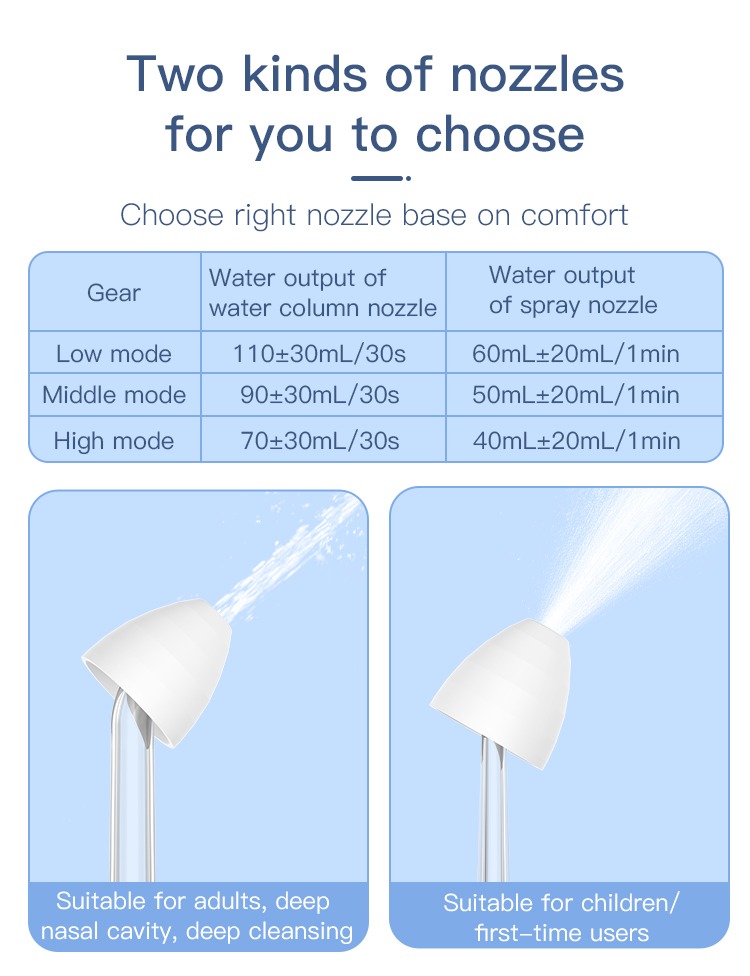 【90-graders roterande spetsar】 Den 360-graders roterande spetsdesignen på näsrengöringen är mer effektiv än Neti-krukan eller andra nässköljanordningar. Med IPX7 vattentät design tillåter nässköljaren att skölja hela kroppen med vatten, vilket är lättare att rengöra och ta hand om din näshåla. |