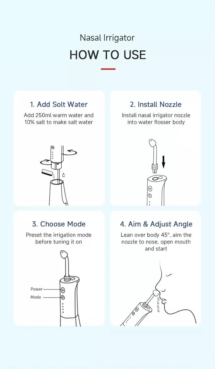 【200 ml vattentank】 Det avancerade nasala sinusbevattningssystemet har en 200 ml löstagbar reservoar med exakt skala, så att du kan njuta av en oavbruten session för att avlägsna sinus. Superlätt att använda, en nyckel för att starta en underbar nässköljresa.