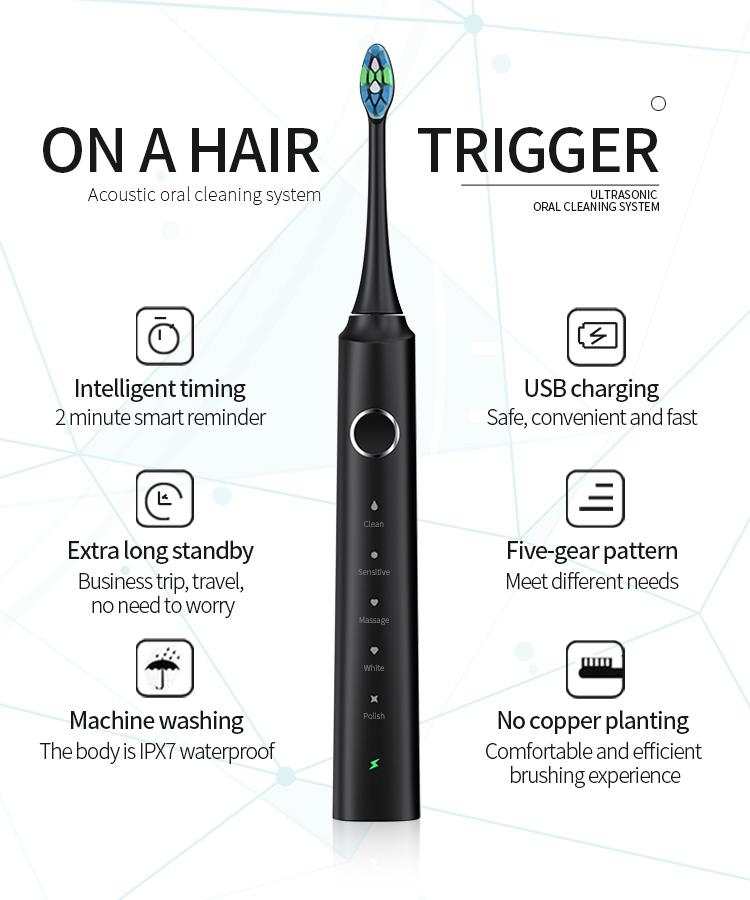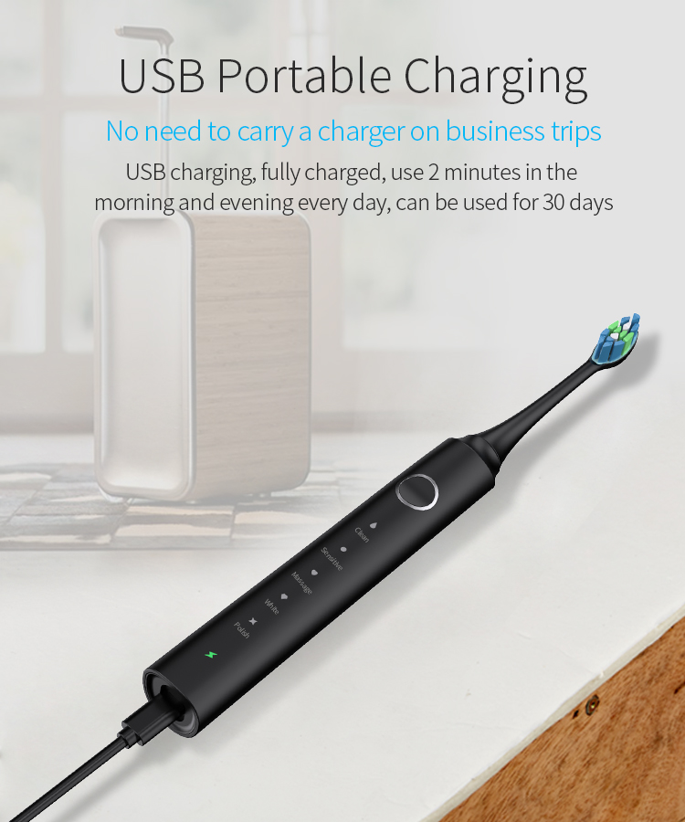 - 5 HÖGPRESTANDA BORSTNINGSLÄGEN - Ren(mild), Vit(stark), Polsk(stark inverteringsfrekvens), Mildare(mild inverteringsfrekvens) och Sensitive(mjuk) för att passa olika förhållanden för tandköttet, så att du kan välja olika lägen enligt dina preferenser och tandläkarens rekommendationer.