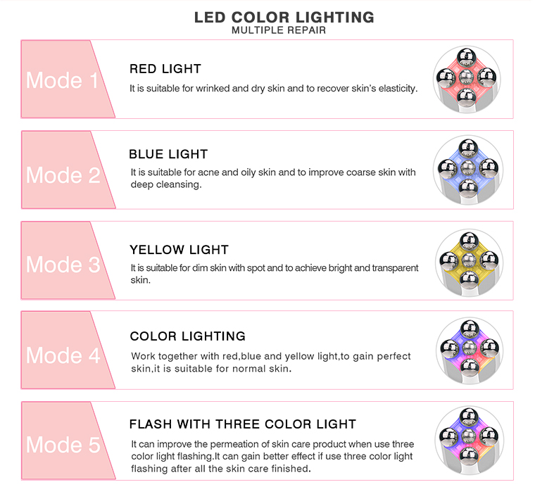VAD ÄR FÖRDELARNA? -- Skönhetsmaskin är en multifunktionell anti-aging-enhet som inkluderar radiofrekvensteknologi (RF) med rött/blått ljusterapi, EMS för att minska linjer och rynkor, förbättra hudpenetration och absorptionsförmåga, etc.
