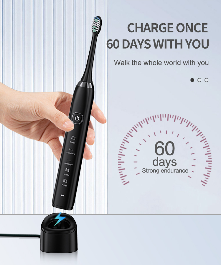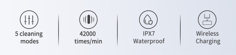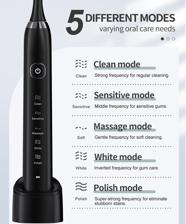 - 5 HÖGPRESTANDA BORSTNINGSLÄGEN - Ren(mild), Vit(stark), Polsk(stark inverteringsfrekvens), Mildare(mild inverteringsfrekvens) och Sensitive(mjuk) för att passa olika förhållanden för tandköttet, så att du kan välja olika lägen enligt dina preferenser och tandläkarens rekommendationer.