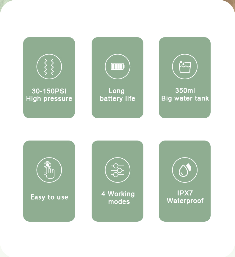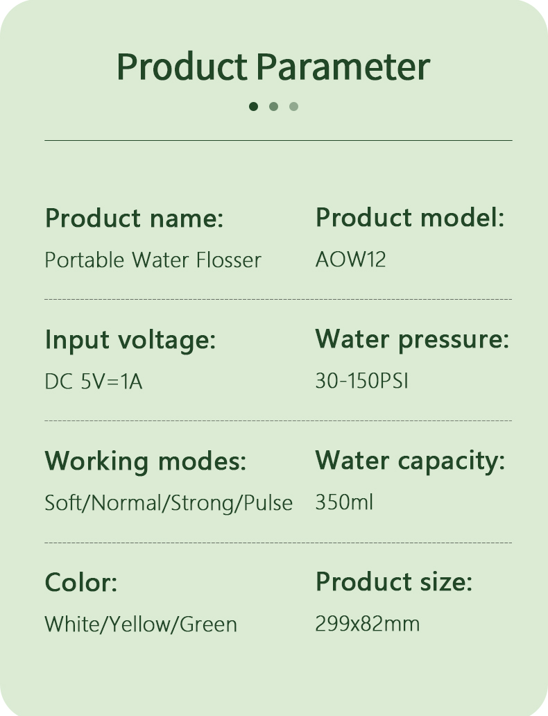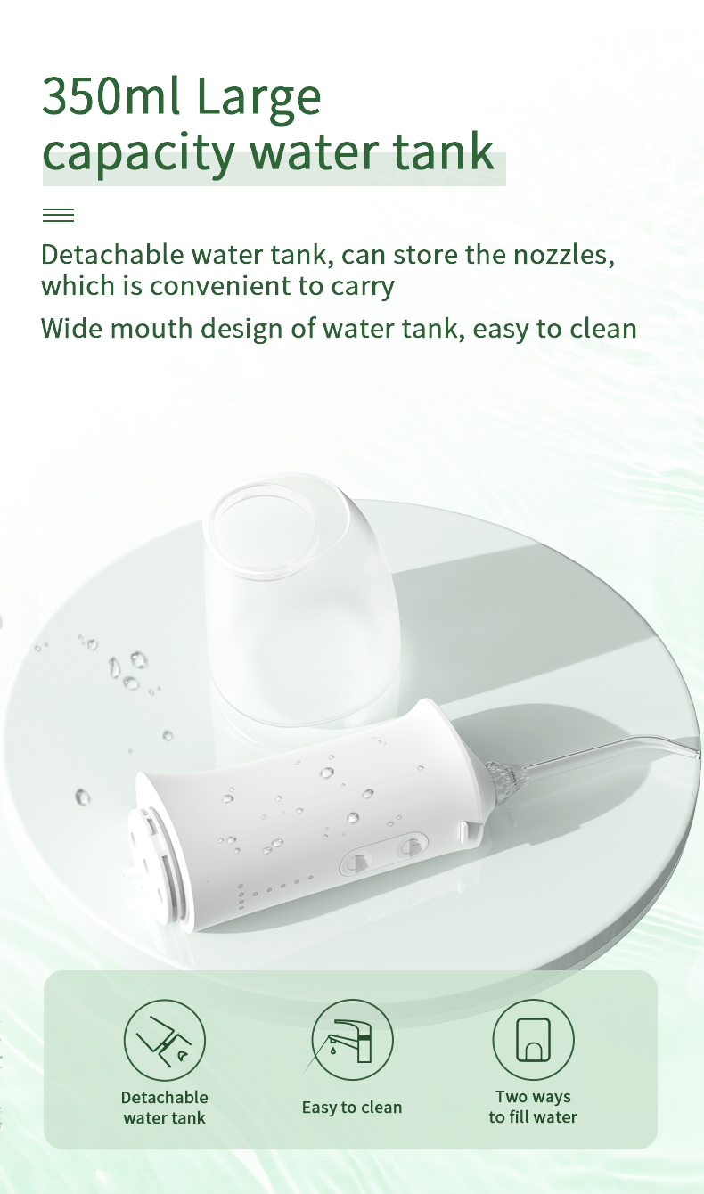 Denna vattentandtråd har en uppgraderad 350 ml vattentank, dubbelt så stor kapacitet som andra gamla modeller, vilket eliminerar behovet av frekventa påfyllningar och gör din munrengöring mer bekväm och effektiv