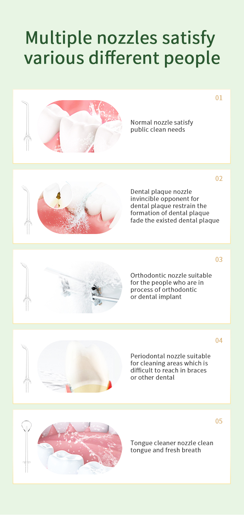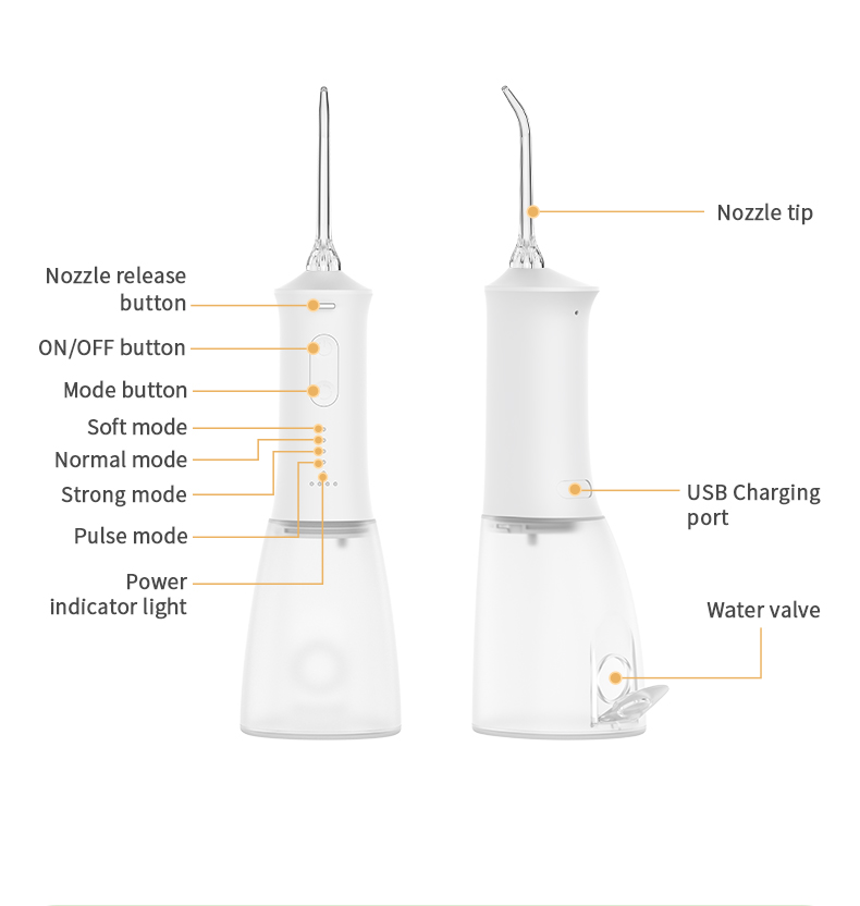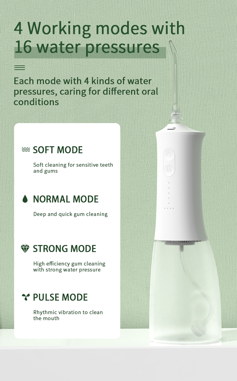 Denna vattentandplocka levererar pulser med högt vattentryck med 1400-1800 gånger per minut, vilket effektivt tar bort 99,9% av tandplack för djup tandrengöring. Denna vattentandplocka masserar tandköttet, främjar blodcirkulationen och åtgärdar orala problem som dålig andedräkt, ortodontiska tänder
